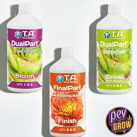 Решение: Terra Aquatica Starter Kit DualPart SW мгновенно решает эту проблему. Формула, специально разработанная для мягкой воды, обеспечивает необходимую базу кальция и магния без дополнительных добавок. А двухкомпонентная система (Grow + Bloom) в сочетании с отраслевым стандартом FinalPart охватывает все потребности удобрений для конопли всего за три бутылки. Это эффективность, простота и мощь в одной коробке.