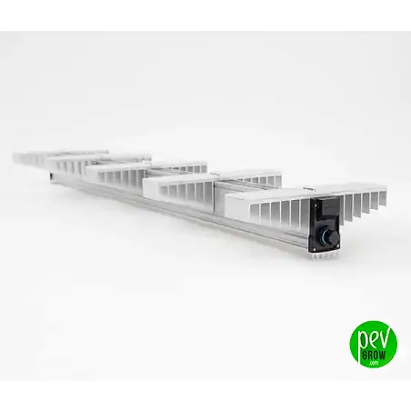 Contiene 5 barras con leds rojos y rojos lejanos de Osram, los más eficaces del mercado en la actualidad, los leds blancos ofrecen la tecnología WICOP de Seoul Semiconductors y el espectro de luz de banda ancha resultante va más allá de la gama PAR convencional, por lo que la incidencia que reciben las plantas es mucho más alta que con otras tecnologías. Gracias a las ópticas secundarias asimétricas inclinables, se puede dirigir la luz hasta donde más nos interese en cada momento, y permiten una homogeneidad lumínica única.