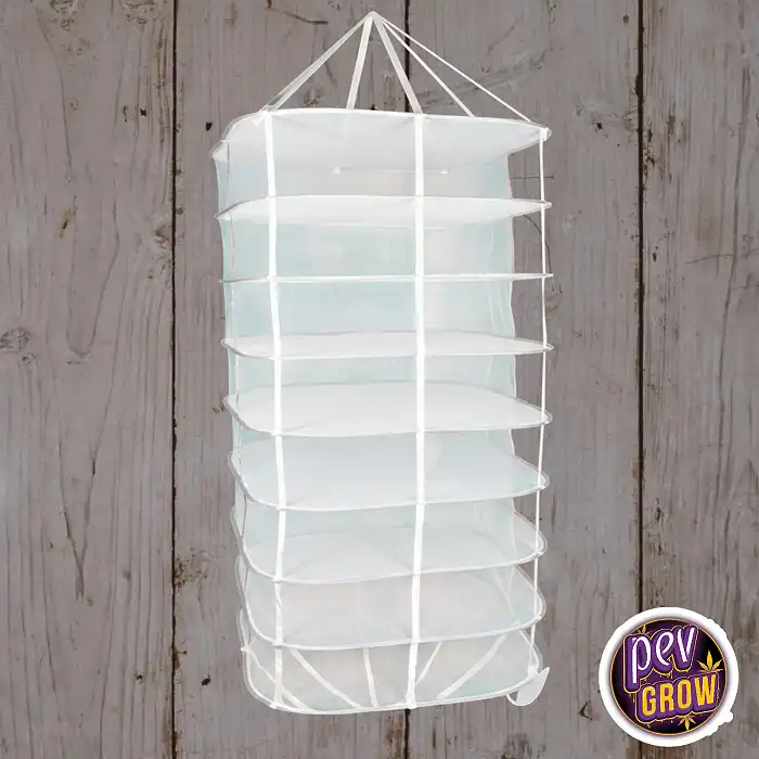 Ya tienes en PevGrow el mejor aliado para el secado de tus plantas de marihuana: ¡El Secador de Malla Cuadrado! Es súper práctico para estructuras o espacios pequeños, cuenta además con un gancho para colgarlo en el techo. Está formado por 8 niveles o estructuras donde colocar tus plantas.