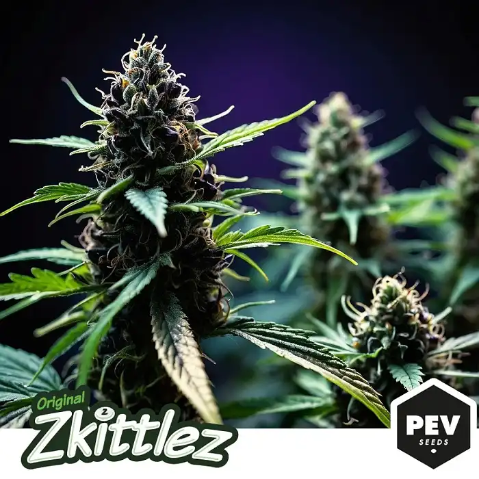 Semillas feminizadas de Zkittlez, un cruce entre Grape Ape y Grapefruit. Predominantemente índica, con sabor dulce y afrutado. Ideal para cultivo interior y exterior. Cosecha en 7-9 semanas. Efecto relajante y meditativo.