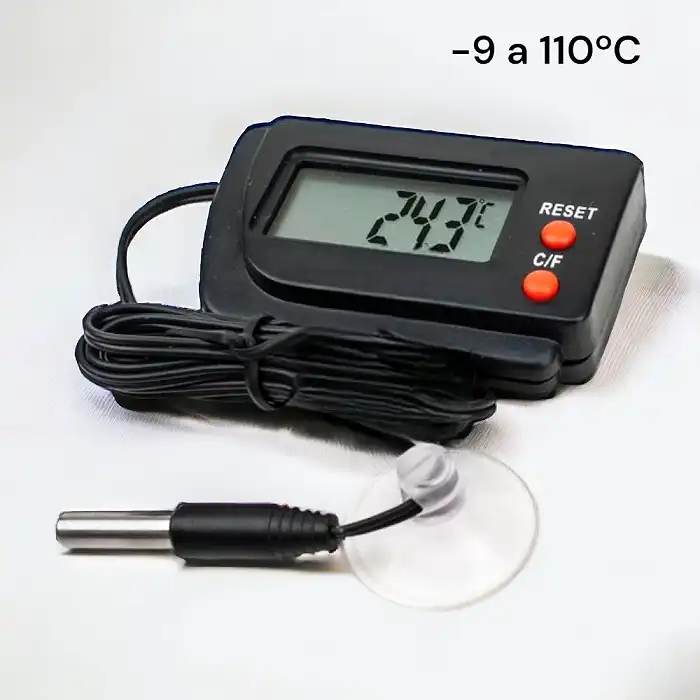 El diseño del Termómetro Digital con Sonda es práctico y fácil de usar. Su tamaño compacto lo hace portátil, ideal para quienes manejan múltiples salas de cultivo. La pantalla LCD proporciona una lectura clara y directa de la temperatura, mientras que sus botones permiten resetear la medición o cambiar entre grados Celsius y Fahrenheit con facilidad. Además, su sonda de 1 metro de longitud te da la flexibilidad necesaria para medir la temperatura en diferentes medios, ya sea en el sustrato, el agua o el aire.