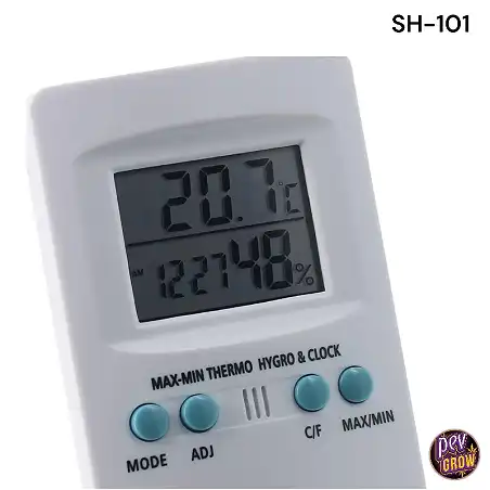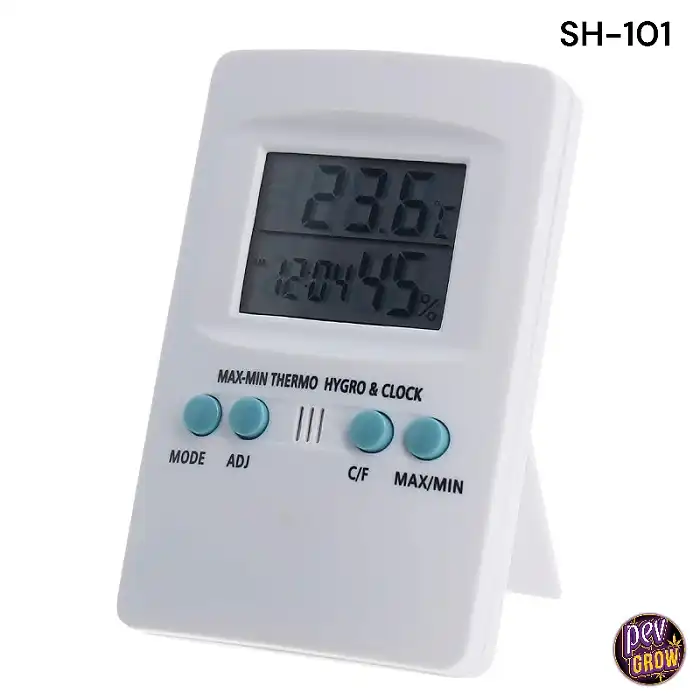 El Termómetro / Higrómetro Termohigrómetro Cornwall Min/Max (SH-101) es la mejor opción para quienes buscan mantener un control climático preciso en sus cultivos. Puedes encontrarlo en la sección de control de clima de Pevgrow. También puedes mirar otras opciones de medidores de temperatura, humedad, PH, EC, etc. por si prefieres un modelo con sonda para no tener que abrir el armario para ver los parámetros ambientales.