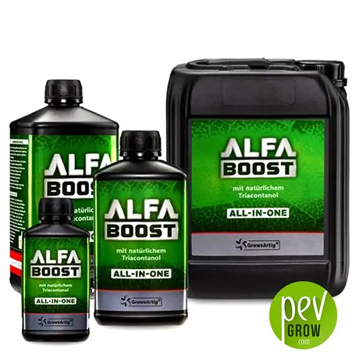 GrowsArtig'in Alfa Boost'u, sadece bitki bazlı bileşenler kullanarak daha yoğun, yapışkan ve kokuşu güçlü çiçekler elde etmenizi sağlayan üst düzey organik bir tomurcuk geliştiricidir.