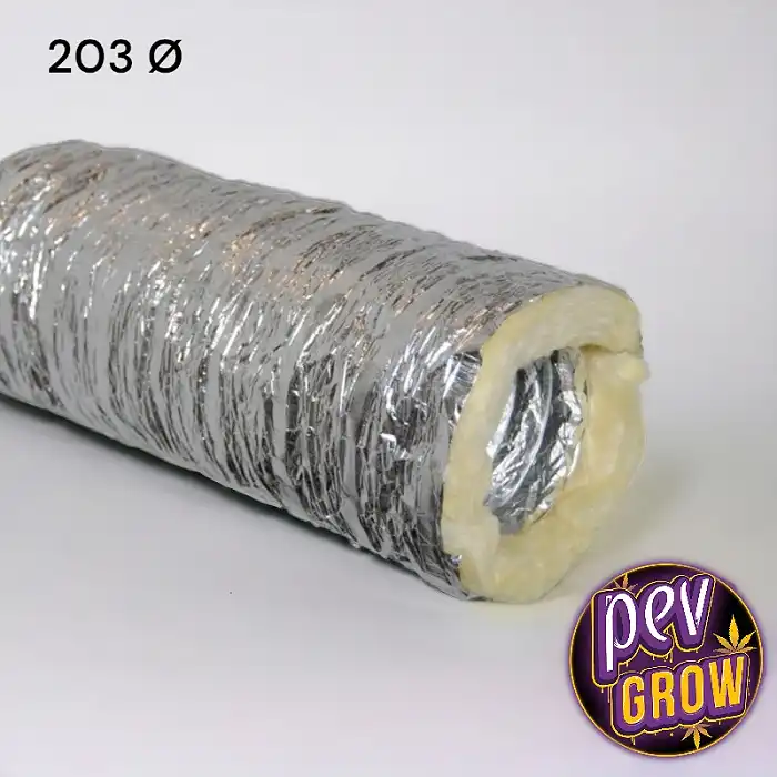El tubo insonorizado que ofrecemos en Pevgrow tiene un diámetro de 203mm y una longitud de 10 metros, lo que lo hace adaptable a diferentes espacios y necesidades. Su interior está recubierto con una capa de lana de vidrio que actúa como aislante acústico, mientras que su exterior está protegido por una capa de aluminio flexible que facilita su instalación en cualquier dirección. Además, su estructura flexible permite que se ajuste a distintos ángulos sin comprometer su eficiencia, lo que lo convierte en una opción versátil para cualquier configuración de cultivo.